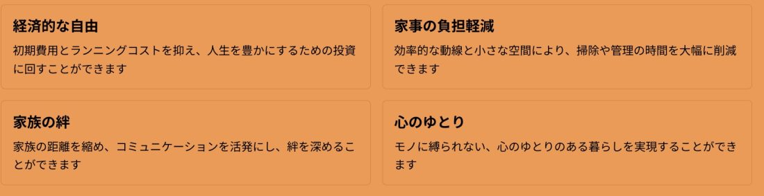 では、具体的に10坪からの小さな家は、私たちの暮らしにどんなメリットをもたらしてくれるのでしょうか?「狭い」という先入観を一度横に置いて、その可能性を見ていきましょう。
