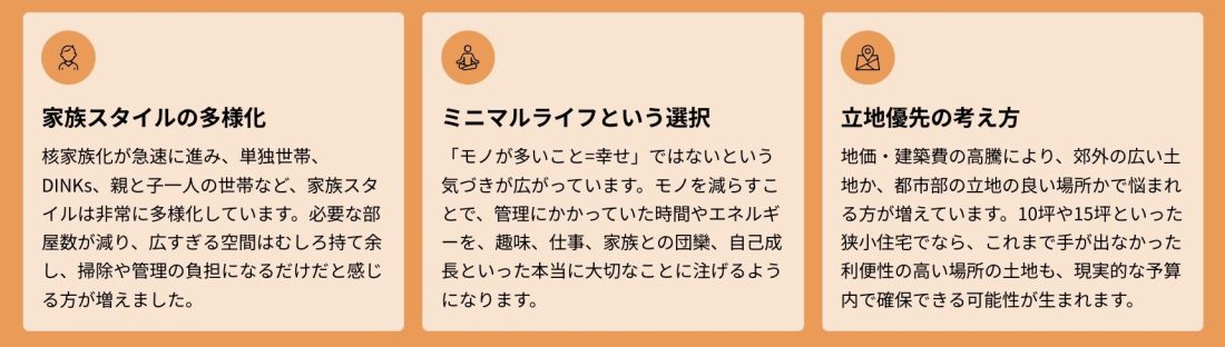 このコラムを通して、10坪からの「小さな家」が、単なる「狭い家」ではなく、現代の社会変化、家族スタイルの多様性、そして私たちのミニマルな価値観に寄り添った、豊かさの新しい基準となりうることをお伝えしたかったのです。