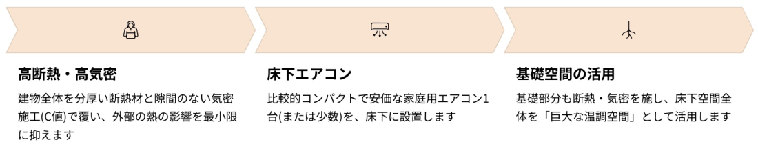 無駄なコストを徹底的に削減し、ZEH仕様の高断熱・高気密、床下エアコン、太陽光発電といった、終の住まいに不可欠なコア技術に経営資源を集中投下。高品質を維持しながら、適正価格を実現しています。