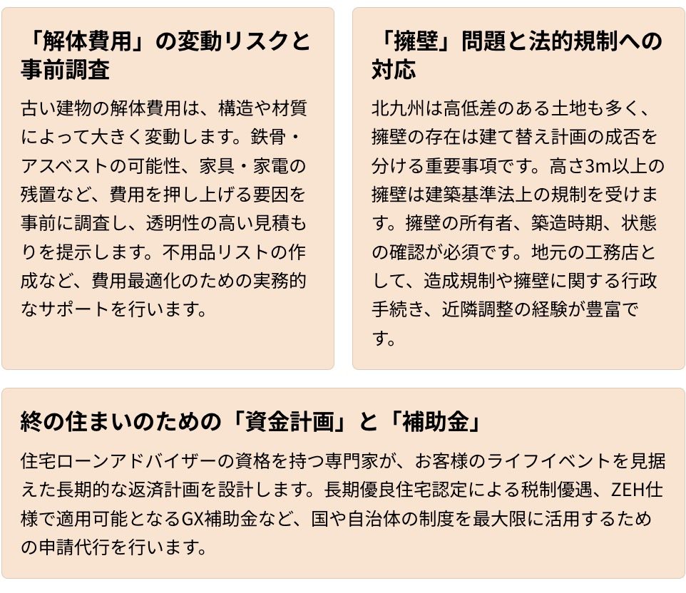 シニア世代の建て替えは、新規で土地を購入して新築するのとは違い、固有の、そして複雑な課題が伴います。ハゼモト建設では、北九州の地域特性を熟知した工務店として、この建て替え特有の不安を解消するための徹底的なサポートを約束します。