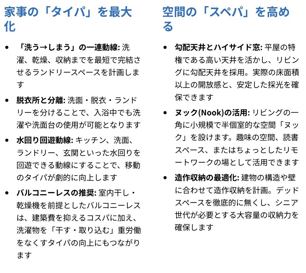お子様が巣立たれた後の終の住まいは、過剰な広さよりも、「暮らしやすさ」と「空間の質」が最優先されます。そこで重要になるのが、タイパ(時間効率)とスペパ(空間効率)という、現代的な設計思想です。