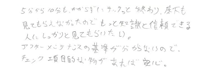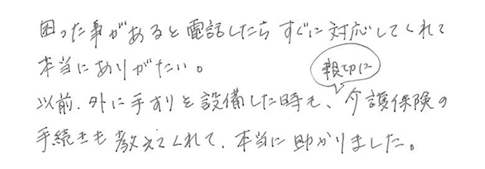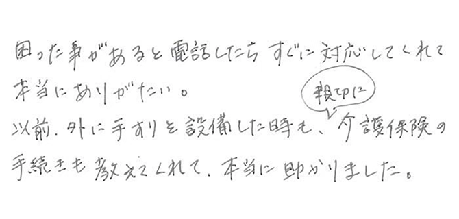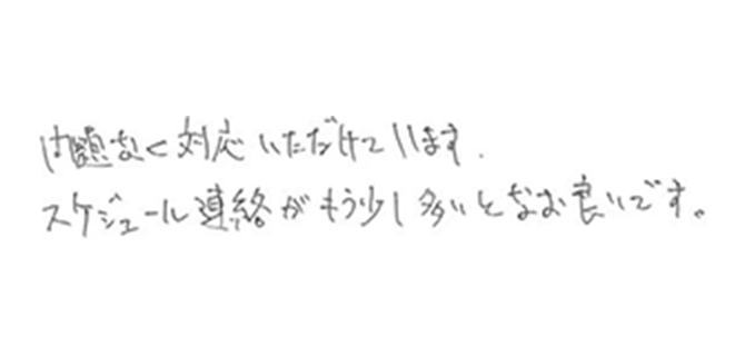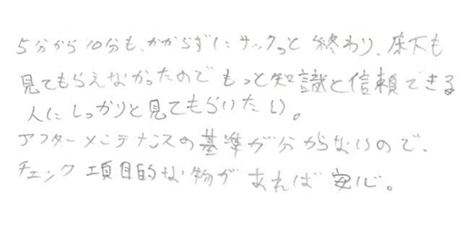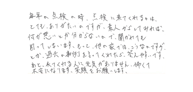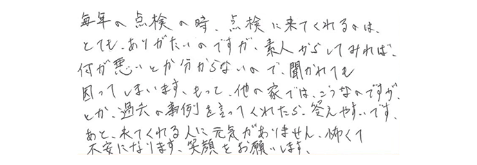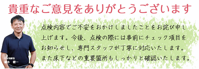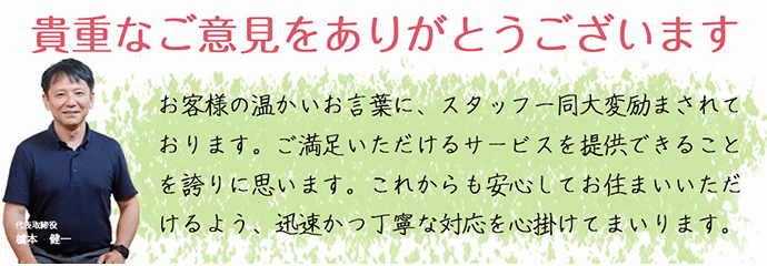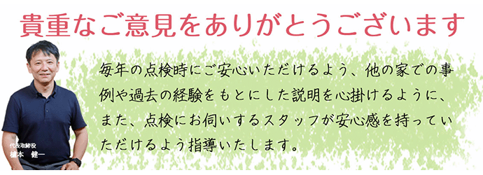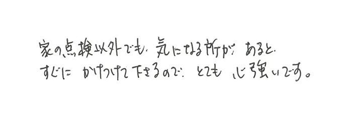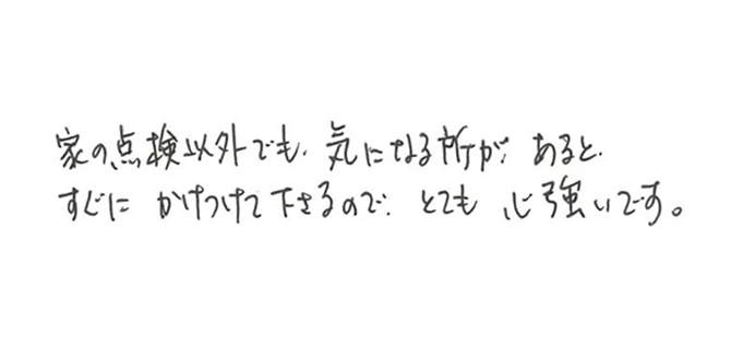 また、家に関する日々のお手入れや不具合など、OB様からのご要望・疑問・質問をお伺いする「お客様相談窓口」を設けて、いつまでも安心して暮らしていただける体制を整えています。