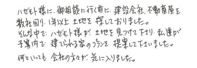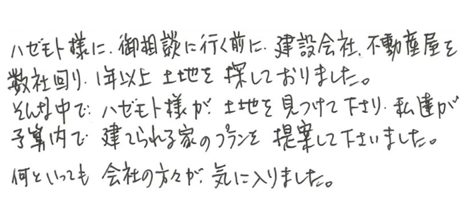 はじめての家づくりで不安も多かったのですが、スタッフの皆さんが一つ一つ分かりやすく説明してくださり、安心して進めることができました。完成した家も想像以上で、本当にお願いしてよかったです。
