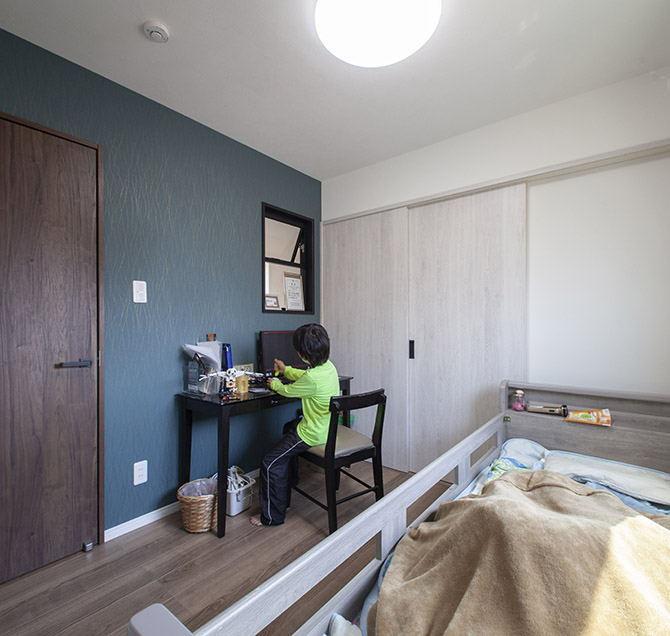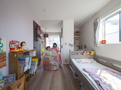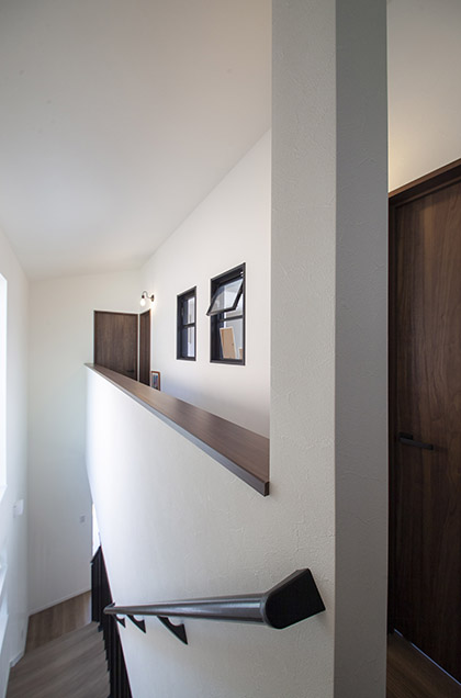 廊下と子供部屋の間につけた室内窓は、自然光と風を