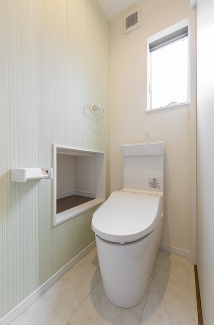 トイレには大きめニッチを作り、トイレットペーパーなどを沢山収納できるようにしました。トイレで必要なものは奥行きが17cm程度あれば充分収納できます。トイレットペーパーが収納できれば、ほとんど大丈夫です。収納にも様々な種類があり、例えば掃除道具を一切見せたくないなどになると、キャビネット型が最も向いているとなりますし、小さなお子様がいらっしゃるならニッチ収納にすることで、一人でトイレットペーパーの交換ができるなどご家庭にあったケースが考えられます。