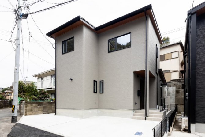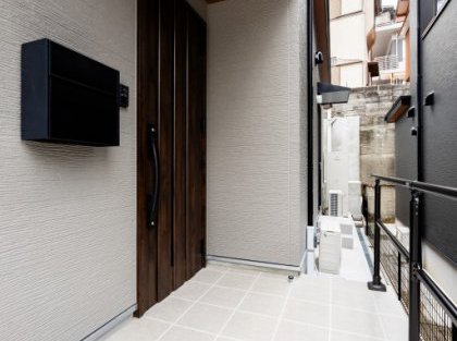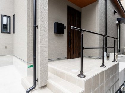 落ち着いたライトグレーの外観が街並みに調和し、上品な印象を与える一邸が完成しました。外玄関には手すりを設置し、毎日の出入りが安心して行えるよう配慮。安全性はもちろん、デザインにもこだわり、建物全体の雰囲気を損なうことなくスタイリッシュに仕上げました。