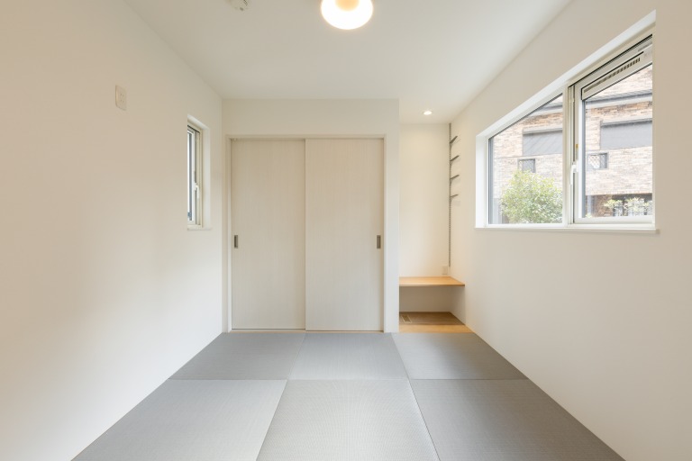 白を基調とした壁と、グレーのモダン畳が落ち着いた空気をつくり出す一室です。