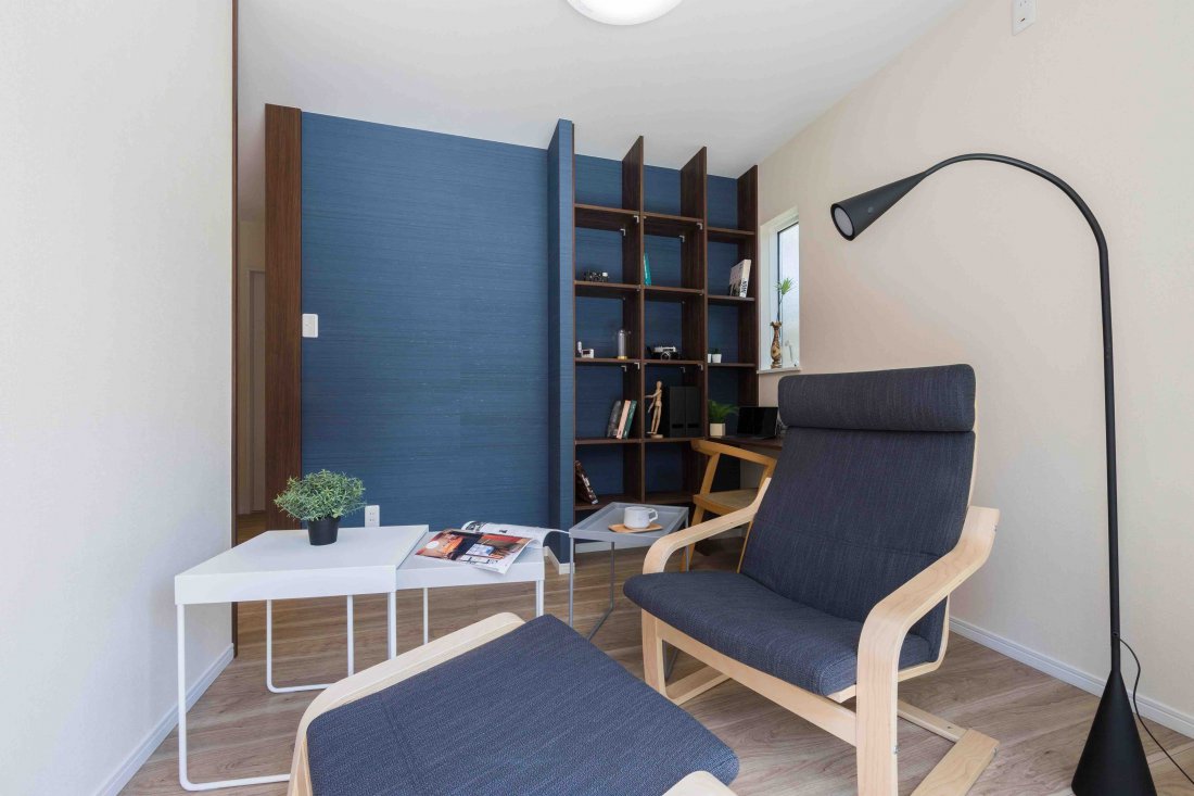 リビング奥の4.5帖のワークスペースはモデルのテーマカラーのネイビーの落ち着いたウォルナットのカウンターがご夫妻ともに使用できます。