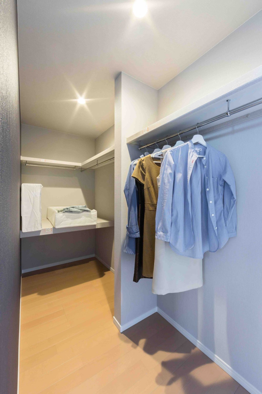 主寝室、眠りにこだわった部屋のカラー、まさかの災害時でも倒れる家具は置かず、扉なしのWICも使いやすさはスムーズです。