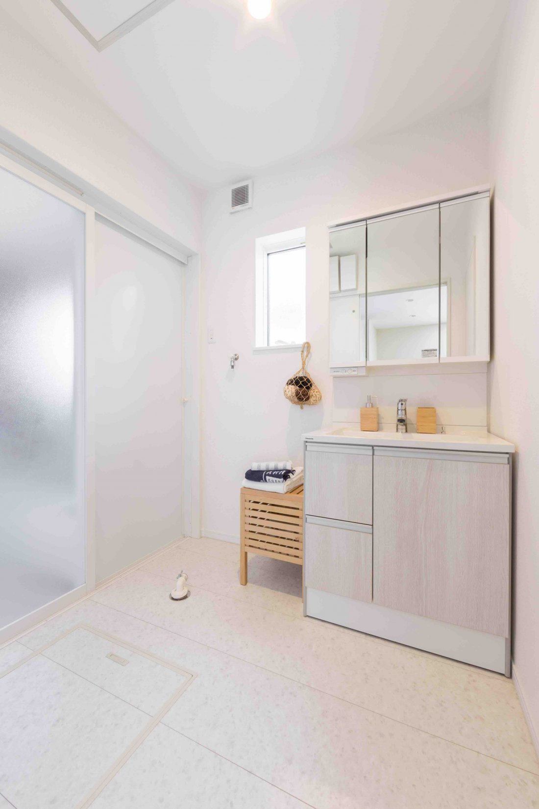 洗面所は階段下を利用した収納があり、着替えやタイルをストックできてとても重宝です。