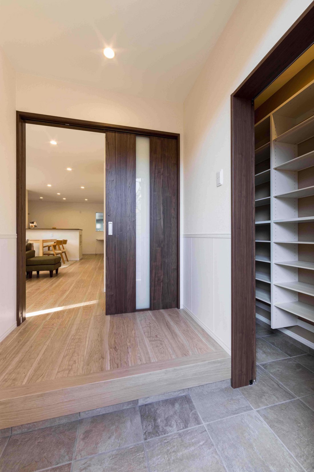 玄関ホール横の1帖のSCLは、一面の棚でたっぷり収納、引き戸を閉じれば玄関ホールはいつでもスッキリ綺麗です。