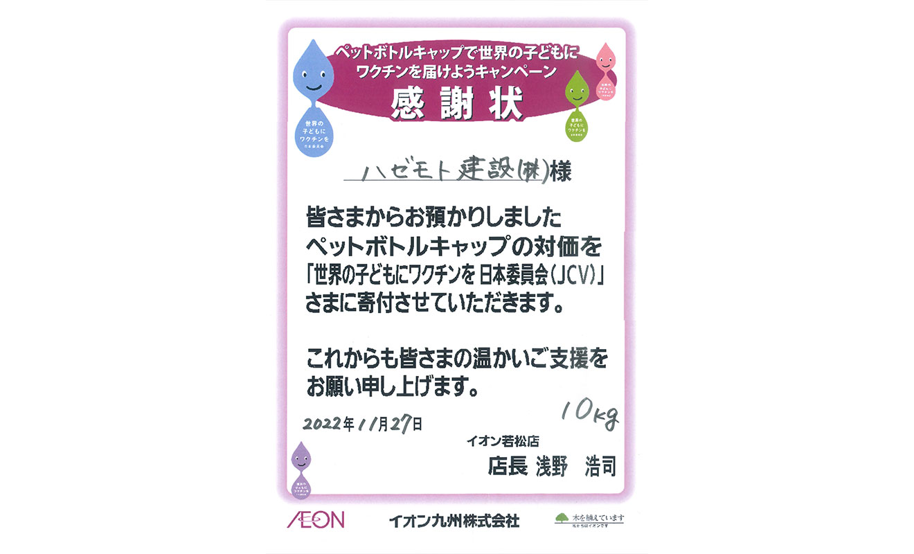 ハゼモト建設では、SDGsへの取組みとしてエコキャップ運動を行なっております。